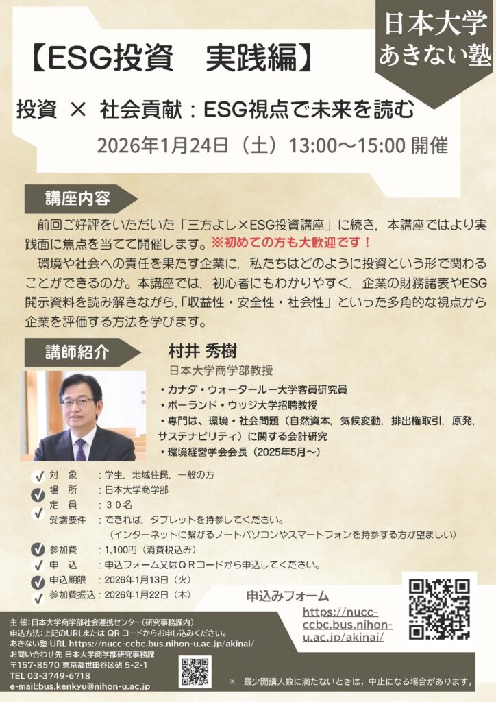 前回ご好評をいただいた「三方よし×ESG投資講座」に続き,本講座ではより実践面に焦点を当てて開催します。