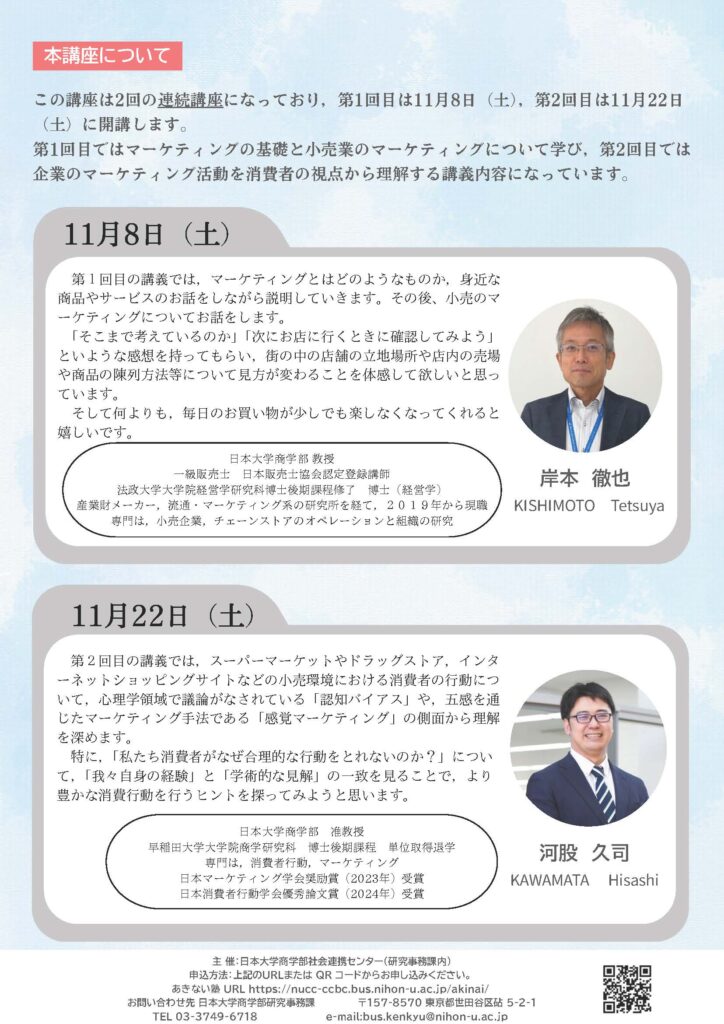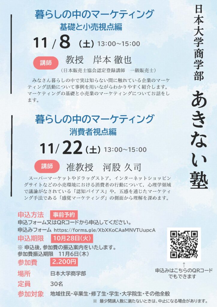 - 講師:11月8日(土):日本大学商学部教授 岸本徹也(日本販売士協会認定登録講師 一級販売士) 11月22日(土):日本大学商学部准教授 河股久司