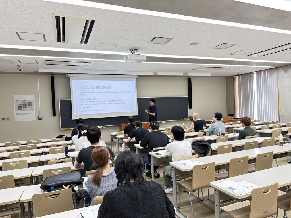本講座では,起業に関心を持つ受講者を対象に,起業に必要な基礎知識を幅広く提供しました。具体的には,株式会社の設立や個人事業主としての開業方法を中心に,それぞれの制度的な違いや法人税など金銭面の特徴について触れながら,実務的なポイントを丁寧に解説しました。