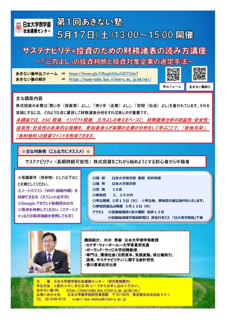 5月17日(土)午後1時から「サステナビリティ投資のための財務諸表の読み方」を開催します。